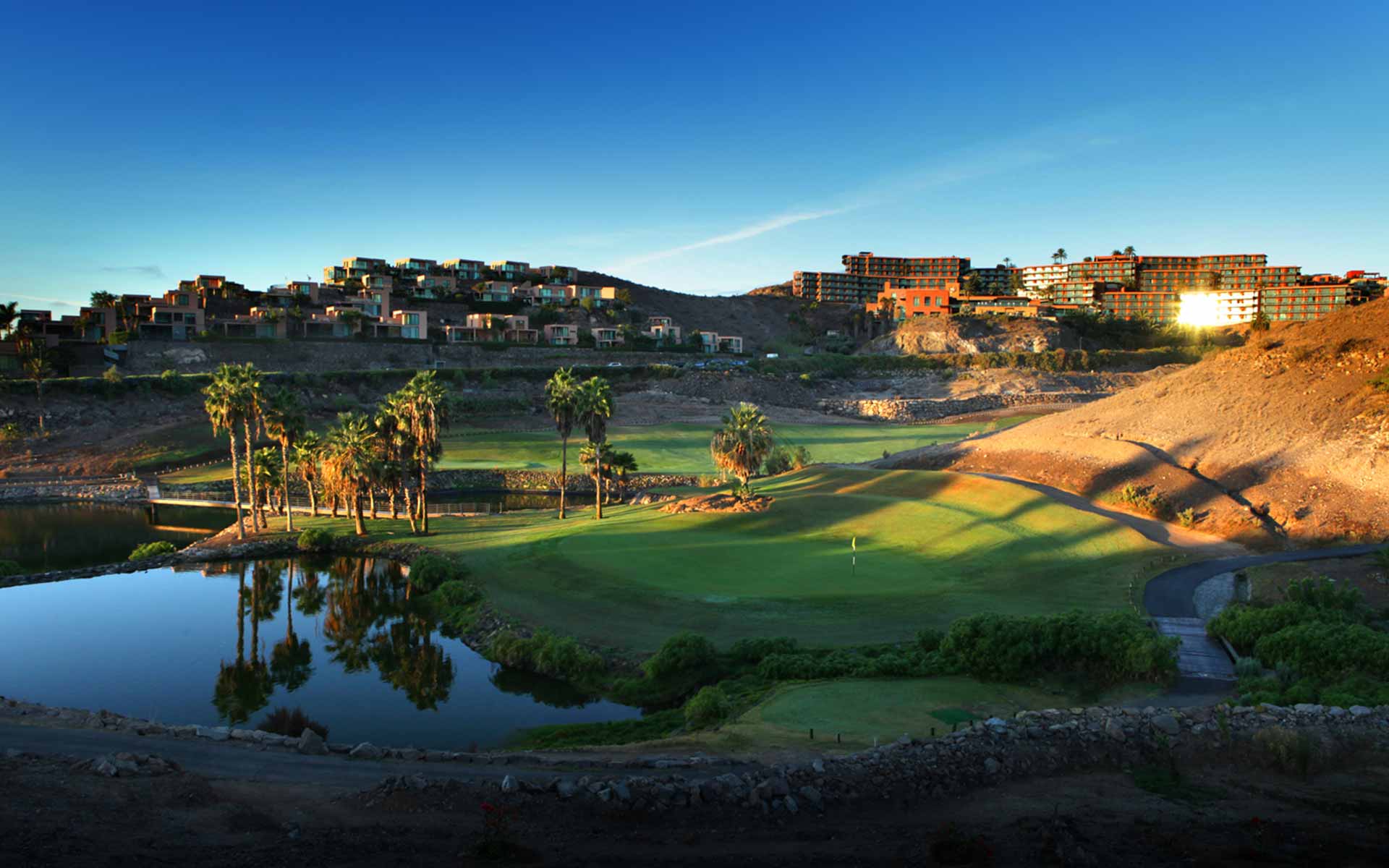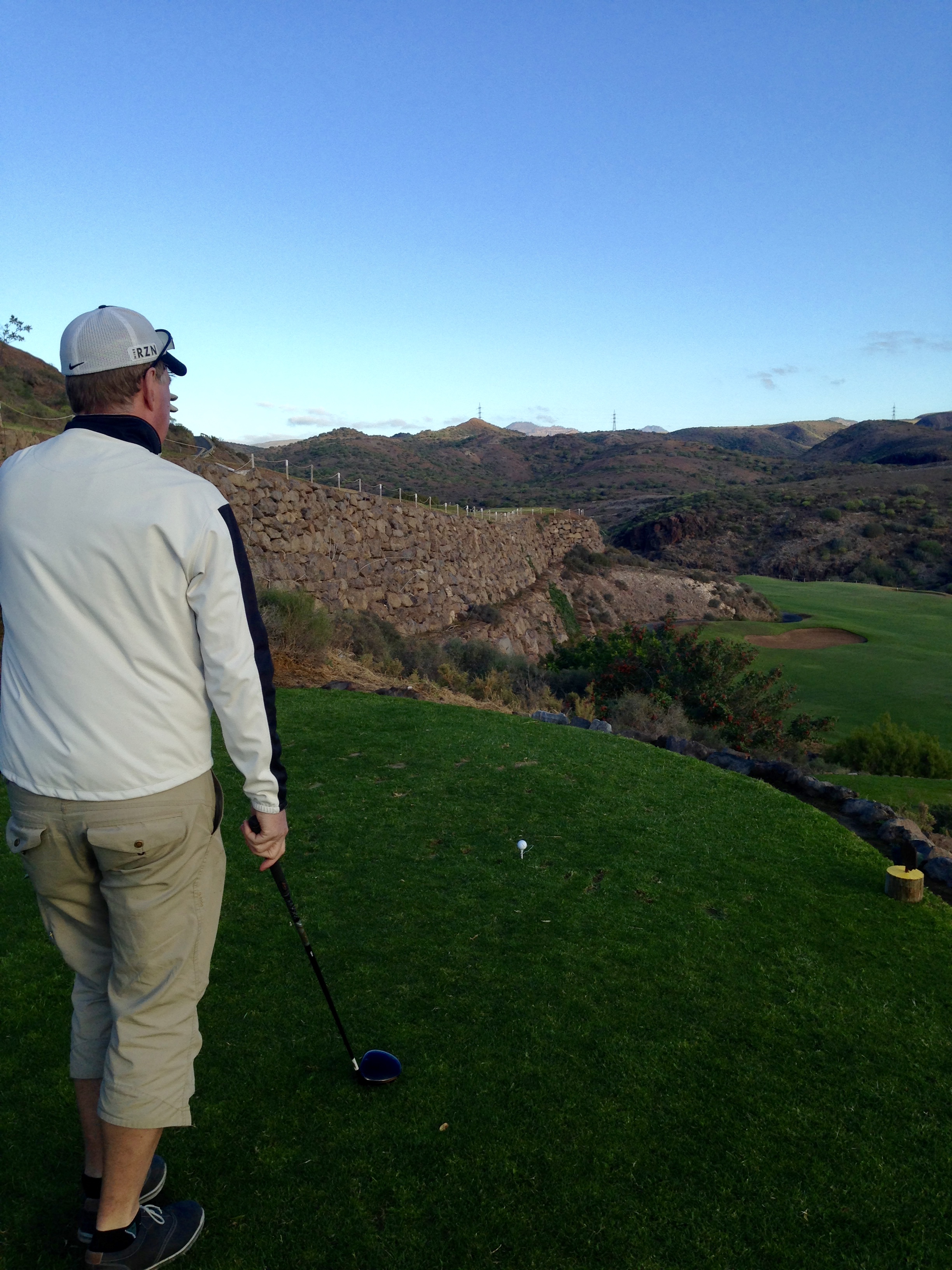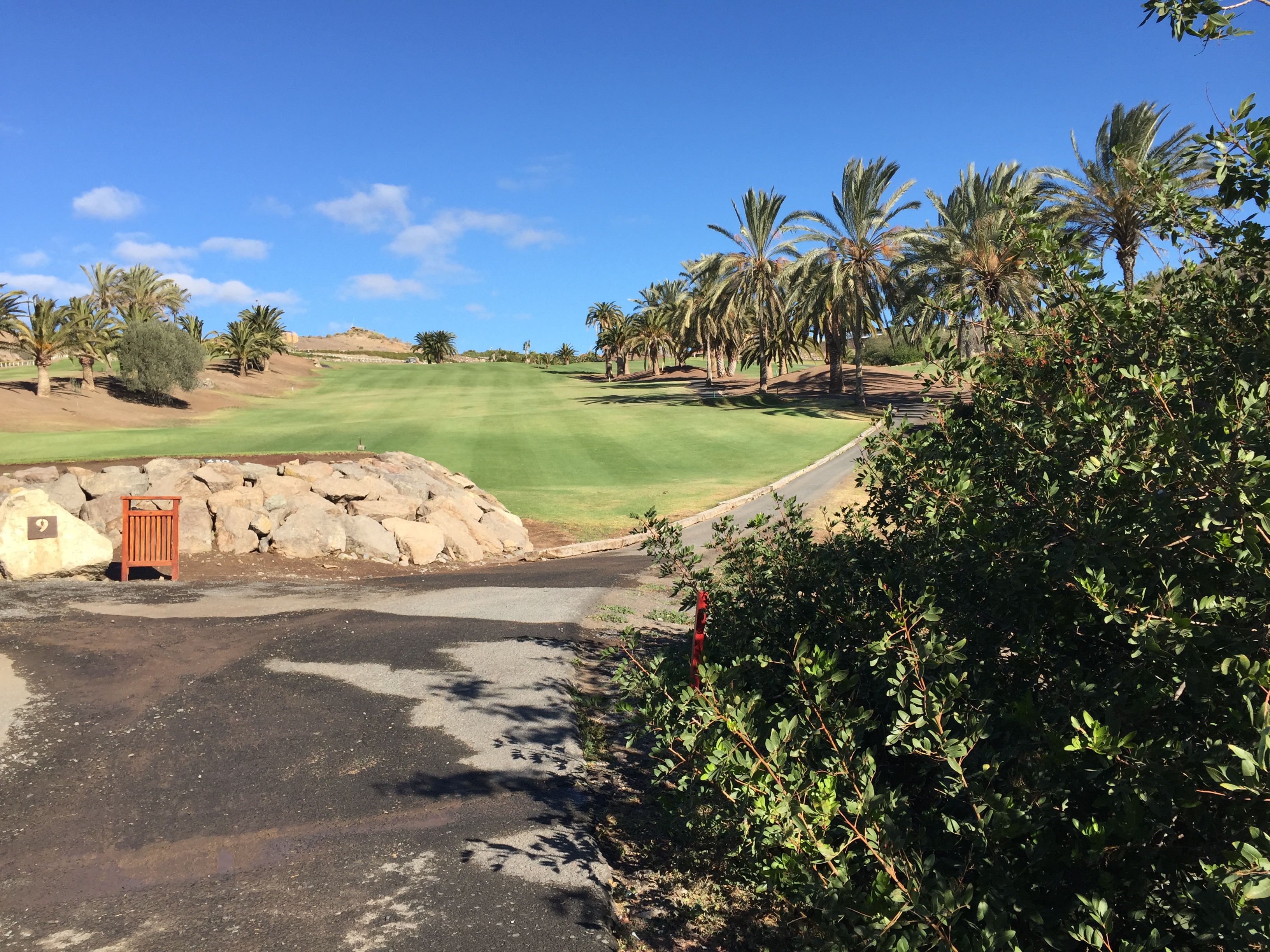 Tredje gången på Kanarieöarna blev en riktig hit. Stället låg långt från kusten och långt från någon stad men innehåll allt man kunde tänka sig. Vädret var skön svensk sommar och det gjorde det behagligt att spela. En parkbana som var trivsam och lite kuperad och sen en supersvår bergsbana av linkstyp men som var jättetrevlig och upplevelserik. Hotellet hade en pool på toppen där man såg ut över nejden ända till Las Palomas. Häftigt. Hit vill jag åka igen. |