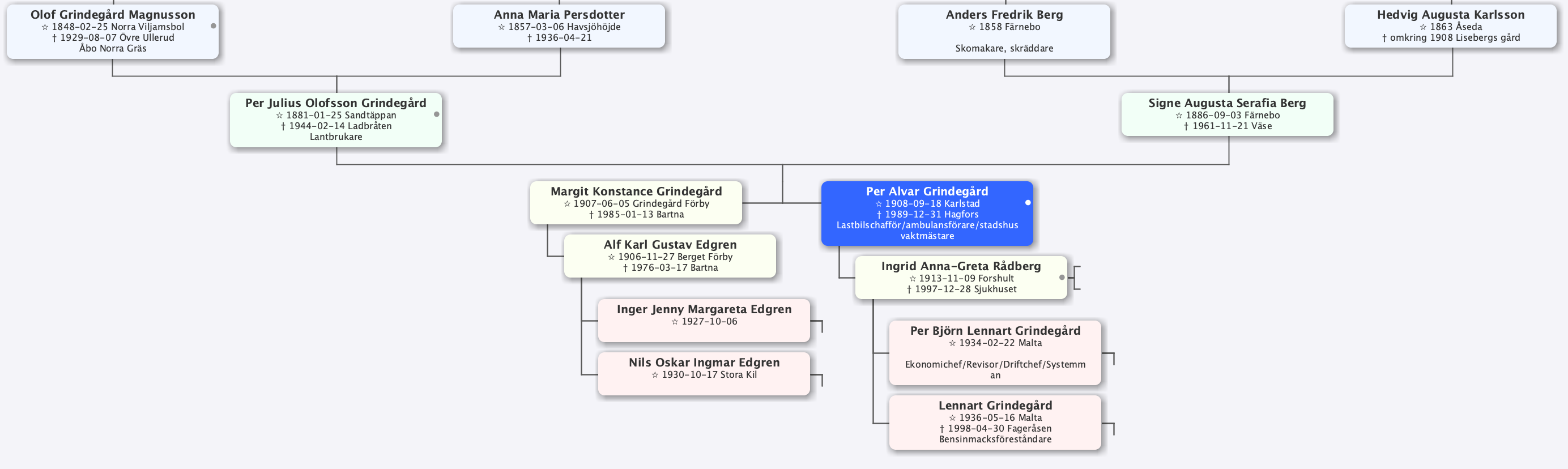 Per Alvar Grindegård föddes 1908 i Karlstad. Föräldrarna Per Julius Grindegård och Signe Augusta Serafia Berg flyttade bara dagar innan hans födsel från familjen på "Grindegården i Förby, Övre Ullerud till Romstad i Karlstad. Signes familj bodde vid denna tid i Edeby där hennes pappa var skräddare. Stora systern Margit Konstance var bara 1år då flytten gick. Pappa Julius verkar ha fått arbete som körkarl det året som familjen bodde i Karlstad. 1909 bar det åter till Övre Ullerud men till Wästsjö där Julius arbetade som skogsarbetare.